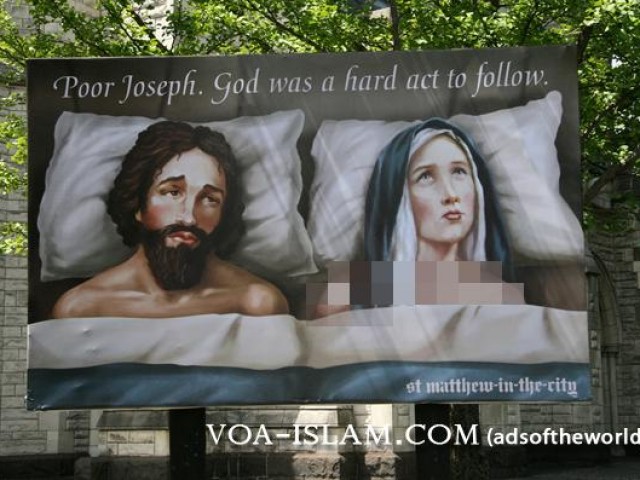 Iklan di billboard itu memperlihatkan Yusuf berwajah sedih sedang berbaring di samping Maria di bawah tulisan, "Poor Joseph. God was a hard act to follow" (Malang benar nasib Yusuf. Tuhan telah berusaha keras untuk mengikutinya).