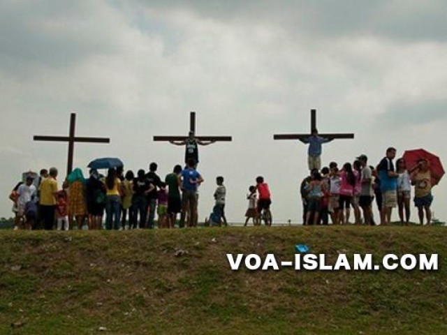 MANILA-FILIPINA (voa-islam.com) – Uskup Agung Filipina berang! Tepat pada hari Jumat Agung beberapa waktu lalu, para gadis turis berpose narsis dengan pakaian tak senonoh di atas kayu salib. Padahal salib itu dipersiapkan untuk ritual peringatan hari kematian Yesus Kristus yang mereka yakini sebagai Tuhan.
