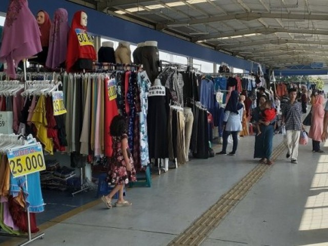 JEMBATAN Penyeberangan Multiguna (JPM) Pasar Tanah Abang berubah menjadi pasar dadakan menjelang hari raya Idul Fitri 2021. JPM disesaki pengunjung yang asyik memilih pakaian meski masa pandemi virus Corona belum berakhir.