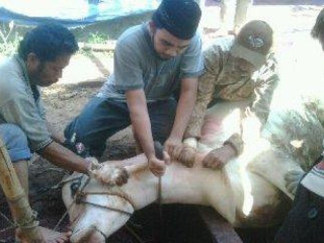 "Dengan Nama Allah, Allah Maha Besar, Ya Allah ini dari-Mu dan untuk-Mu, ini kurban dariku." Di tambah: