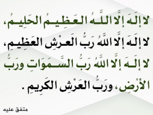 لَا إِلَهَ إِلَّا اللهُ الْعَظِيمُ الحلِيمُ، لَا إِلَهَ إِلَّا اللهُ رَبُّ الْعَرْشِ الْعَظِيمِ، لَا إِلَهَ إِلَّا اللهُ رَبُّ السَّمَوَاتِ وَرَبُّ الْأَرْضِ وَرَبُّ الْعَرْشِ الْكَرِيمِ