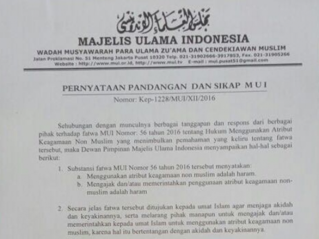 Sehubungan dengan munculnya berbagai tanggapan dan respons dari berbagai pihak terhadap fatwa MUI Nomor: 56 tahun 2016 tentang Hukum Menggunakan Atribut Keagamaan Non-Muslim yang menimbulkan pemahaman yang keliru tentang fatwa tersebut, maka Dewan Pimpinan Majelis Ulama Indonesia menyampaikan hal-hal sebagai berikut: