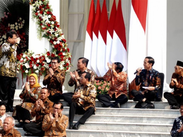 Prabowo resmi jadi menhan. Dilantik Jokowi di tangga istana. Beserta seluruh kabinet Jokowi, Prabowo duduk di anak tangga itu. Jokowi-Ma'ruf tetap duduk di atas.