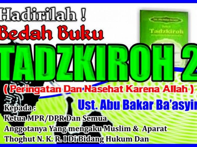 Buku monumental berisi peringatan dan nasihat Ustadz Abu Bakar Ba’asyir karena Allah SWT Kepada Ketua MPR/DPR dan semua anggotanya yang mengaku Muslim, serta aparat Thaghut NKRI di bidang hukum dan pertahanan yang mengaku Muslim