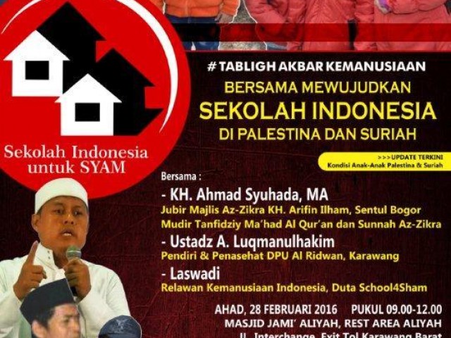Ikutilah Tabligh Akbar Kemanusiaan yang bertema 'Bersama Mewujudkan Sekolah Indonesia di Palestina dan Suriah' yang digelar oleh Sekolah Indonesia untuk Syam, yang in sya Allah akan diselenggarakan pada: