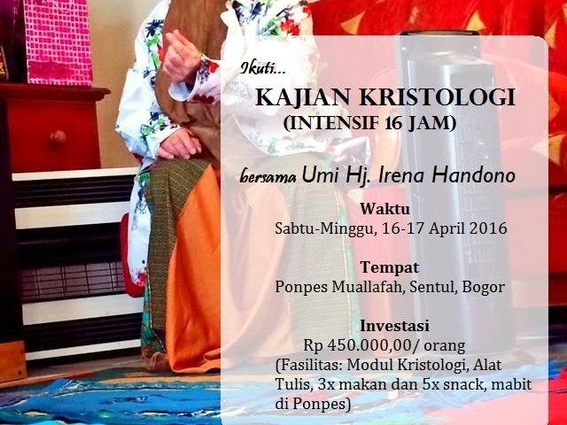 Yayasan Pembentengan Aqidah dan Pembinaan Muallaf IRENA CENTER kembali menggelar Kajian Kristologi Intensif 16 Jam (2 Hari) bersama Ustazah Hj. Irena Handono. Acara tersebut akan diselenggarakan di Pondok Pesantren Mualafah, Sentul - Bogor, pada Sabtu, 16 April - Minggu, 17 April 2016, mulai pukul 07.00-paripurna.