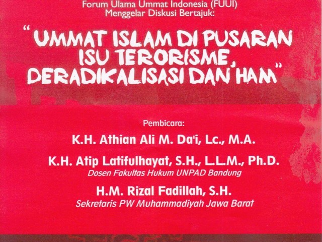 “Ummat Islam di Pusaran Isu Terorisme, Deradikalisasi dan HAM” pada Sabtu, 13 Agustus 2016 Pkl.09.00-12.00 WIB di Masjid Al Fajr, Jl. Cijagra Raya No.39 Buah Batu Bandung.