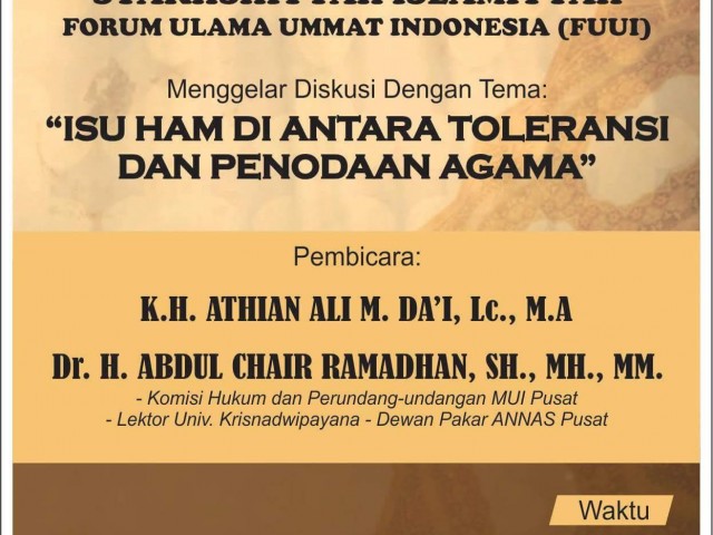 Menggulirkan isu HAM yang tidak pada tempatnya terutama menyangkut Toleransi dan Penodaan Agama pada gilirannya akan menimbulkan kerancuan hukum. Untuk mengantisipasi timbulnya kerancuan hukum terhadap Isu HAM ini, Majelis Taklim Syakhshiyyah Islamiyyah Forum Ulama Ummat Indonesia (MTSI-FUUI) akan menggelar diskusi dengan Tema: “Isu HAM Di Antara Toleransi dan Penodaan Agama”.