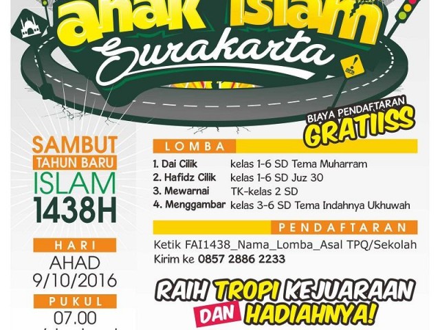 Dalam menyambut tahun baru islam 1438H, Lembaga Koordinasi Gerakan Taman Pendidikan Al-Quran (LKG TPQ) akan menyelenggarakan kegiatan Pawai Akbar Anak Islam Sambut Tahun Baru Hijiryah dan Festival 1438 Anak Islam Surakarta Sambut Tahun baru Islam 1438H.