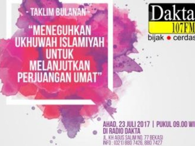 Hadirilah Taklim Bulanan Dakta yang mengangkat tema, "Meneguhkan Ukhuwah Islamiyah Untuk Melanjutkan Perjuangan Umat". Pada: