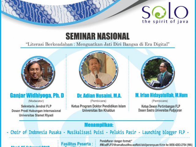 SURAKARTA (voa-islam.com), Forum Lingkar Pena (FLP) akan menyelenggarakan acara Seminar Nasional di Aula Gedung F FKIP Universitas Sebelas Maret (UNS), Surakarta, Jawa Tengah, pada Ahad, 25 Februari 2018 besok. Seminar tersebut adalah bagian dari rangkaian acara Gebyar Milad FLP ke-21.