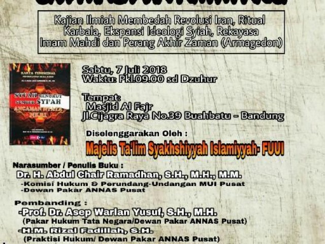 Kehadiran ideologi Syiah Iran tidak sedikit telah menimbulkan ancaman, bukan hanya kepada aqidah ummat Islam, tetapi juga sangat berpotensi mengancam keutuhan dan kedaulatan Negara Kesatuan Republik Indonsia (NKRI). Apa dan bagaimana bentuk ancamannya? Jawabnya, hadiri bedah bukunya karya Dr. H. Abdul Chair Ramadhan, S.H., M.H., M.M. denganTema: SYIAH ANCAMAN NYATA NKRI, pada :