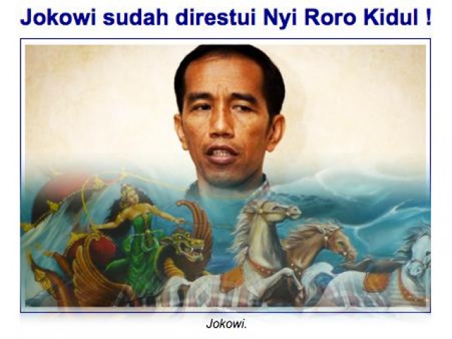 Demikian halnya dengan kampanye berikut ini, seakan-akan semesta mendukung Jokowi, tak tanggung-tanggung kisah musyrik Nyi Roro Kidul pun disematkan pada Jokowi, jangan-jangan bikin cerita baru Mak Lampir dan Sundel Bolong cemburu pada Jokowi,....Naudzubillah....