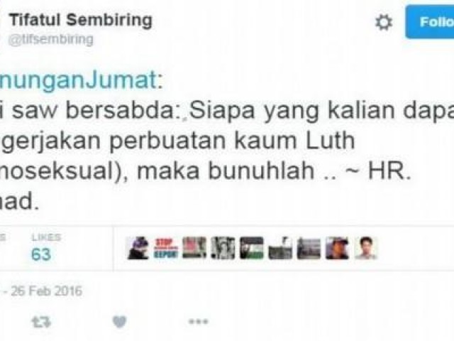 Pada, Jumat (26/2/2016) Tifatul berkicau mengutip sebuah hadits riwayat Imam Ahmad, siapa yang melakukan perbuatan kaum Nabi Luth, maka bunuhlah.