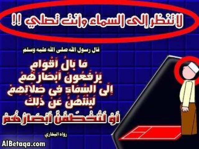 "Hendaknya kaum-kaum yang mengarahkan pandangan mereka ke langit dalam shalat itu bertaubat atau pandangan mereka terebut tidak akan kembali kepada mereka." (HR. Al-Bukhari Muslim)