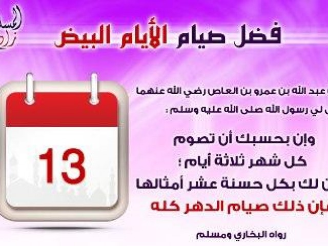 "Puasa tiga hari setiap bulan adalah puasa dahr (puasa setahun). Dan puasa ayyamul bidh (hari-hari putih) adalah hari ketiga belas, empat belas, dan lima belas." (HR. An Nasai dan dishahihkan al Albani)
