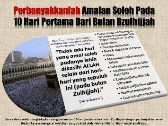 "Tidak ada satu amal shaleh yang lebih dicintai oleh Allah melebihi amal shaleh yang dilakukan pada hari-hari ini (yaitu 10 hari pertama bulan Dzul Hijjah)." Para sahabat bertanya: "Tidak pula jihad di jalan Allah?" Nabi shallallaahu 'alaihi wasallam menjawab: "Tidak pula jihad di jalan Allah, kecuali orang yang berangkat jihad dengan jiwa dan hartanya namun tidak ada yang kembali satupun." (HR. Abu Dawud dan Ibnu Majah)
