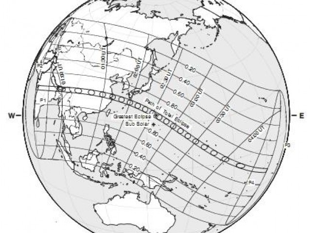 Berikut ini ringkasan prediksi/perhitungan gerhana yang dikeluarkan oleh Fred Espenak, astronom NASA yang dijuluki Mr. Eclipse. Lintasan bayangan umbra bulan berawal di India dan bergerak melewati Nepal, Bangladesh, Bhutan, Myanmar dan China. Setelah meninggalkan daratan Asia, lintasan tersebut melewati kepulauan Okinawa (Jepang selatan). Lintasannya lalu membelok ke arah tenggara menuju samudera Pasifik.