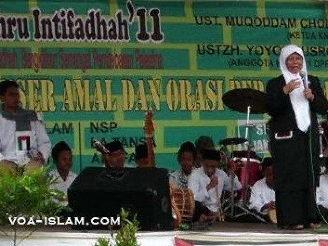 Demikian orasi Ketua Komite Nasional Rakyat Palestina (KNRP) DR Muqoddam Cholil dalam peringatan “Syahrul Intifadhah II” di Kampus Sekolah Tinggi Ekonomi Islam (STEI) SEBI Sawangan, Jawa Barat, belum lama ini. Selain orasi juga digelar konser amal dengan menampilkan parade nasyid, di antaranya Izzatul Islam (Izis), Brigief, Thumband dan tim nasyid lainnya.