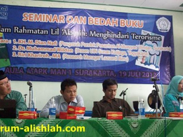 Kamis pagi hingga siang (19/7/2012) bertempat di Aula MAPK MAN 1 Surakarta yang terletak disebelah timur Universitas Slamet Riyadi (UNISRI) Surakarta, MAN 1 Surakarta bekerjasama dengan LSM Lazuardi Birru dari Jakarta mengadakan acara Seminar dan Bedah Buku.
