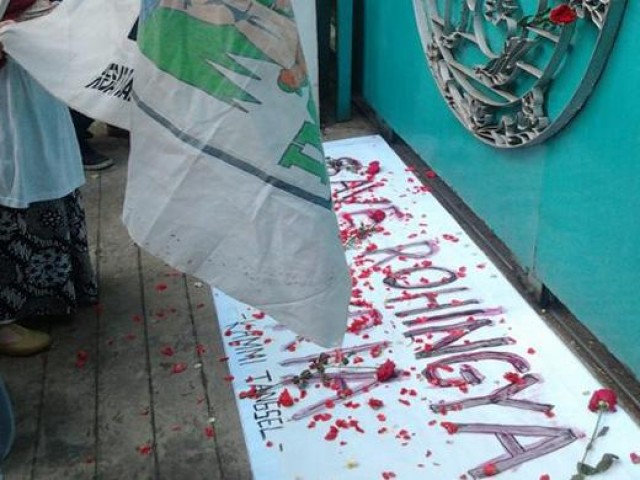 Aksi yang digelar Jum'at (20/7/2012) di depan gedung Kedubes Myanmar itu diikuti oleh berbagai kelompok mahasiswa seperti Kesatuan Aksi Mahasiswa Muslim Indonesia (KAMMI) Daerah Tangsel, Pemuda Muslim Tangsel, dan Liga Mahasiswa untuk Perdamaian Dunia.