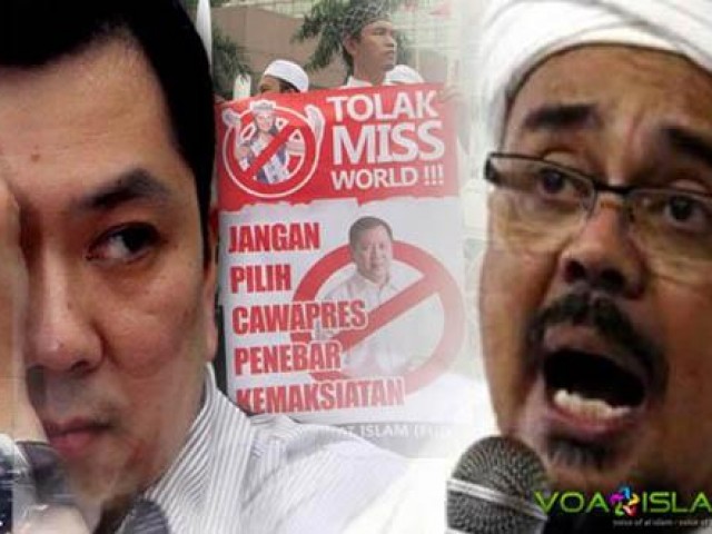 “HT telah mengirimkan surat untuk menyogok MUI supaya menjadi penasehat Miss World, itu kalau mau (MUI -red) nanti pondok pesantren yang diasuh MUI diberikan parabola indovision gratis, langganan gratis,” kata Habib Rizieq di Jakarta, Sabtu (14/9/2013).