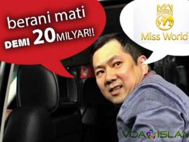 JAKARTA (voa-islam.com) – Pada akhir bulan September ini, pagelaran ekspoitasi sekularisme Miss World dengan dukungan massa internasional dan zionis akan mencapai puncaknya. Tarik ulur dan manuver Hary Tanoe di Jakarta terus menyeruak dalam beberapa pemberitaan media tanah air, meski pemerintah telah 'mengusir' event tersebut ke Bali ternyata belum cukup memuaskan hasrat Hary Tanoe untuk terus mengeruk uang haram milyaran rupiah.