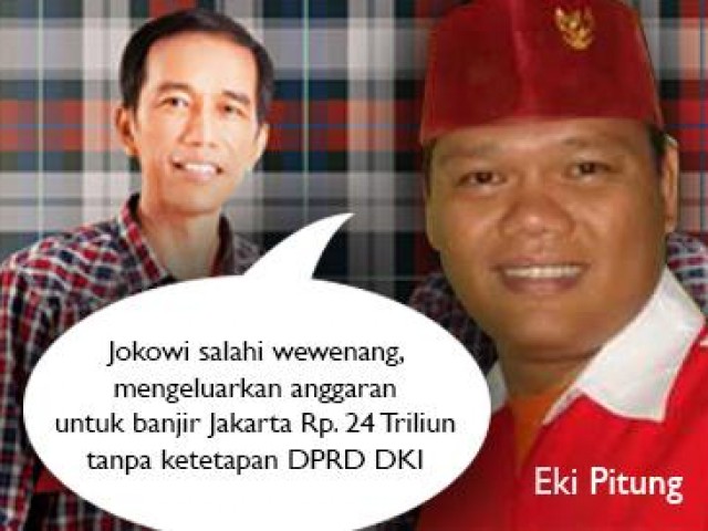 Masih menurut Eki Pitung "Jokowi ini lebih parah dari Foke, karena dasar hukum yang pernah dilakukan Gubernur sebelumnya dan mengikuti langkah FOke mengeluarkan anggaran tanpa ketetapan dan persetujuan dari DPRD DKI dengan jumlah luar biasa besar, sebesar Rp. 24,2 Triliun dan Rp. 24 miliar untuk konsumsi makan-makan tamu Jokowi. Padahal anggaran itu di gelontorkan tidak melalui mekanisme resmi penetapan di DPRD DKI"