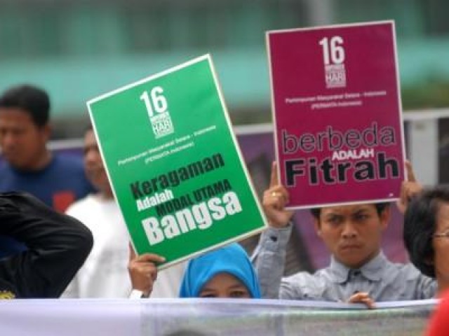 Puluhan massa yang tergabung dalam Aliansi Masyarakat Sipil untuk Toleransi melakukan aksi damai memperingati hari toleransi Internasional di Bundaran HI, Jakarta, Sabtu (16/11).