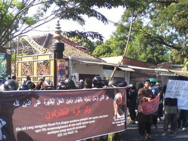 Tadi siang, selepas sholat Jum’at (22/05), gabungan elemen Muslim yang terdiri dari Laskar Umat Islam Surakarta (LUIS), Laskar Jamaah Ansharut Tauhid (JAT), Majelis Taklim Al Huda, Majelis Taklim Al Ishlah sekitar pukul 13.30 mendatangi pengurus Walubi ( Perwakilan Umat Buddha Indonesia) Surakarta.