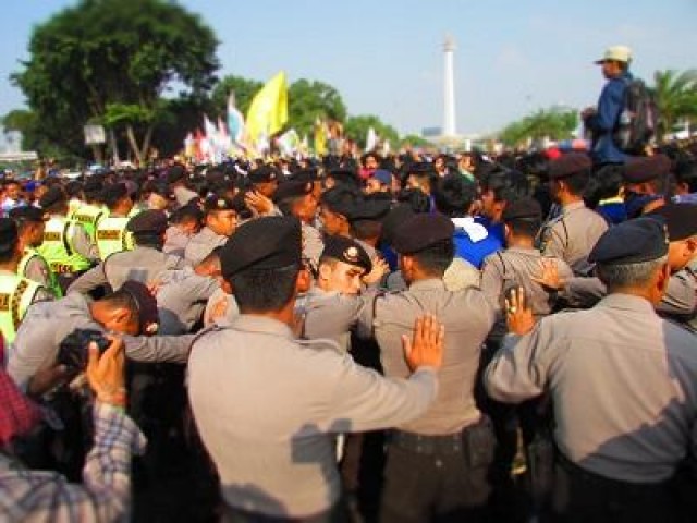 JAKARTA (voa-islam.com)- Pada saat aksi yang dilakukan oleh hampir seluruh kampus Indonesia hari Kamis (21/05/2015) di depan Istana Negara sempat terjadi aksi saling dorong. Namun keadaan itu tidak dermikian. Ada beberapa mahasiswa yang terjatuh, bahkan ada pula yang ditendang oleh aparat polisi.