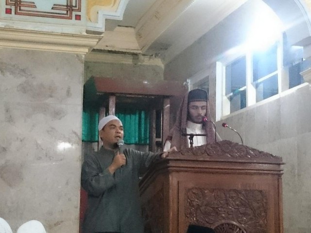 Sebelum menjadi Imam Tarawih, Syaikh Abdurrahman mengisi kuliah tujuh menit di hadapan ratusan jamaah yang menyesaki ruangan Masjid Baiturrahman.