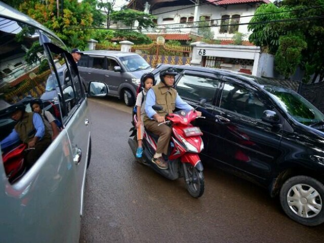 Mantan Mendikbud itu memang memilih mengantar anaknya menggunakan kendaraan roda dua karena dia tahu akan sedikit macet. Maklum, di hari Senin akan padat kendaraan yang lalu lalang.