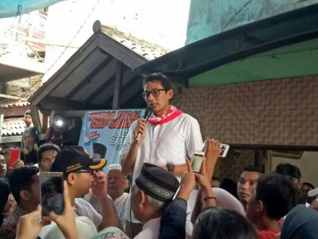 Sandi bertemu dengan warga dan melakukan sosialisasi di Jalan Bhakti Mulya RT 08/02, Tegal Alur, Kalideres, Jakarta Barat, Selasa (7/3). Kepada Sandi, warga yang berada di bantaran kali Jembatan Tempe (Tegal Alur) mengeluh. Pasalnya, beredar kabar warga yang tinggal di sekitar bantaran kali bakal digusur.