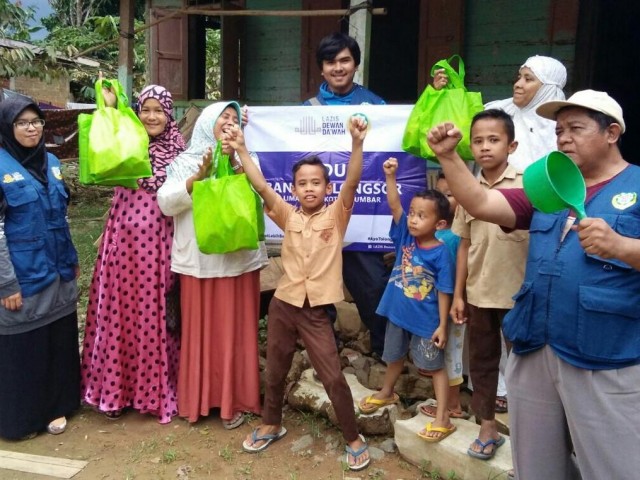 Untuk menghibur warga korban banjir, LAZIS Dewan Dakwah dan Bukittinggi membagikan bingkisan berupa family kit. Isinya perlengkapan mandi, mencuci, dan pempers bayi.