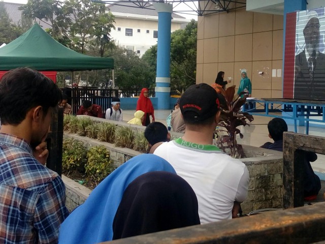 Meski ruang utama dan tribun Gymnasium sudah dipenuhi oleh peserta. Bahkan, ruang bawah juga disesaki peserta. Antrian pengunjung masih terus berdatangan.