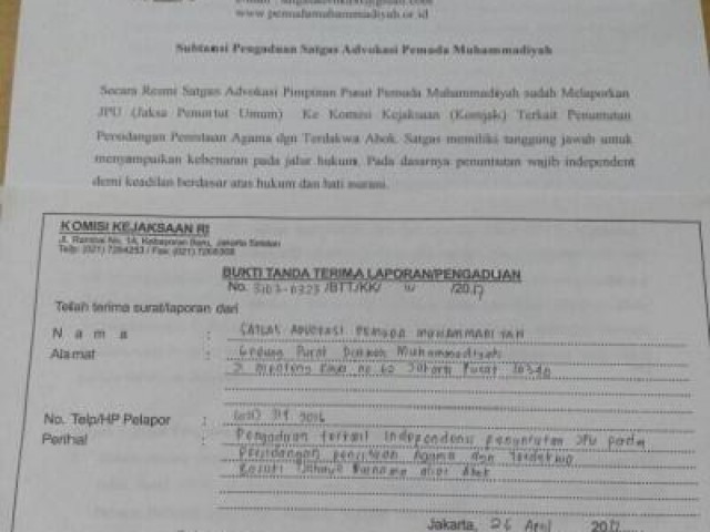JAKARTA (voa-islam.com)- Advokasi Pimpinan Pusat Pemuda Muhammdiyah kemarin, Rabu (26/04/2017) mengadukan Jaksa Penuntut Umum (JPU) ke Komisi Kejaksaan. Aduan ini disebabkan karena JPU dianggap tidak menunjukkan keadilannya dalam mengambil keputusan, yakni menuntut Ahok di kasus penistaan agama beberapa Minggu lalu.