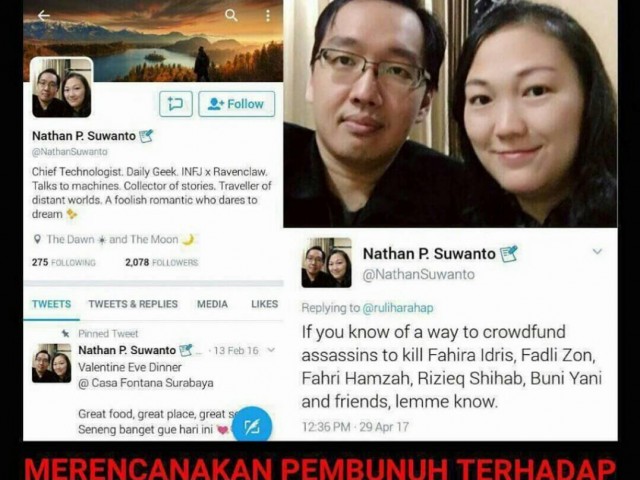 JAKARTA (voa-islam.com)--Seorang netizen bernama Nathan P. Suwanto yang tinggal di Surabaya membuat geger dunia maya. Pasalnya, postingannya di Twitter menyebutkan dia bersedia ikut menyewa pembunuh bayaran untuk membunuh sejumlah tokoh, seperti Wakil Ketua DPR Fadli Zon, anggota DPD Fahira Idris, Pemimpin FPI Habib Rizieq Syihab serta Buni Yani.