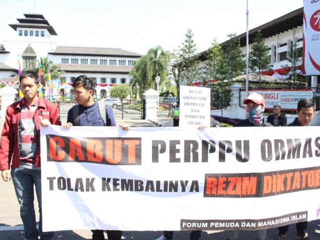 “Kami menuntut pencabutan Perppu Nomor 2 thaun 2017. Alasan pemerintah untuk terbitnya Perppu tersebut tidak bisa diterima karena bertentangan dengan fakta yang ada,” katanya.
