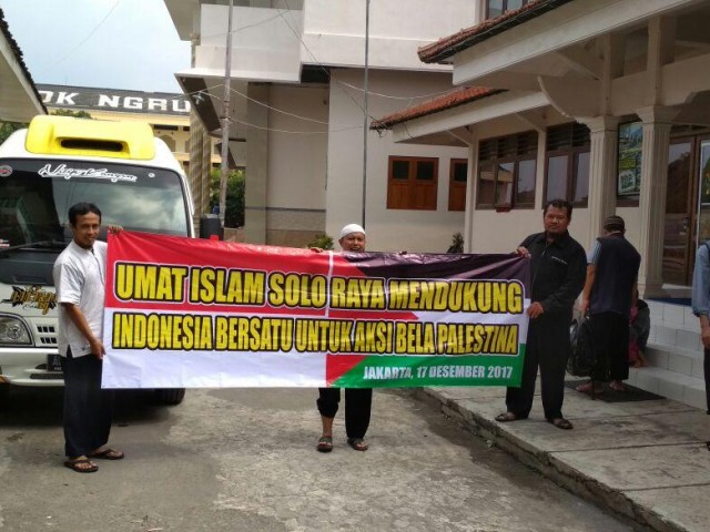 SOLO (voa-islam.com)--Dewan Syariah Kota Surakarta (DSKS) beserta elemen ummat Islam Solo raya memberangkatkan rombongan peserta aksi bela Palestina, Sabtu (16/12/2017) siang. Hal ini merupakan bentuk dukungan pada seruan Majelis Ulama Indonesia (MUI) Pusat.