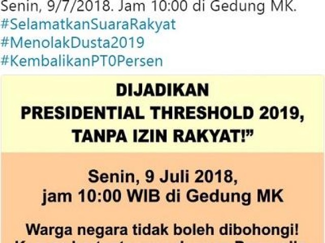 Maka, ia pun menghimbau agar besok, Senin, 9 Juli 2018 kelangsungan gugatan itu untuk dikawal dan diikuti dengan seksama. “Maka Hari SENIN 9 JULI 2018 besok mulai sidang JUdicial Review (JR) meminta Presidential Threshold ditiadakan, teman-teman akan berkumpul jam 10 PAGI di Mahkamah Konstitusi, yang berminta dimohon hadir jam 9:30 WIB.”
