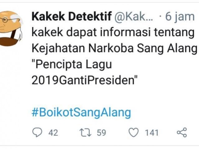 Akun @kakekDetektif berkicau sok tau, "Kakek Detektif dapat informasi tentang kejahatan narkoba Sang Alang, pencipta lagu 2019 Ganti Presiden." kicau akun yang kerap menuduh tokoh Islam yang berseberang dengan rezim.