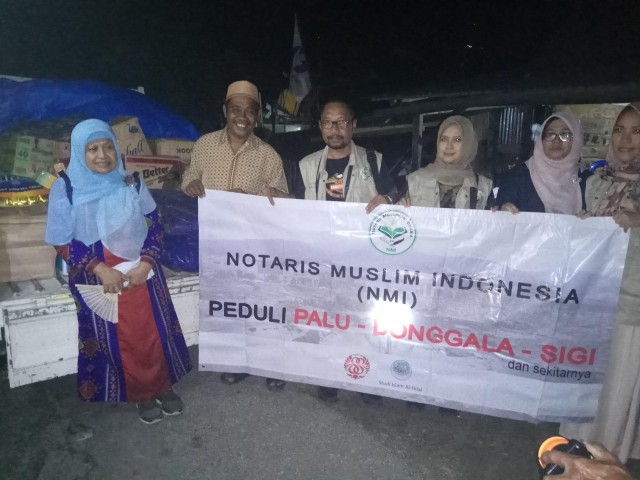 Notaris Muslim Indonesia (NMI) terjun langsung ke Palu, Sigi dan Donggala melakukan proses tanggap bencana. Kepala Bidang Pengabdian Masyarakat NMI, Sinta Dewi, SH mengatakan lembaganya telah menyiapkan bantuan berbagai macam kebutuhan harian pengungsi seberat 5 ton.