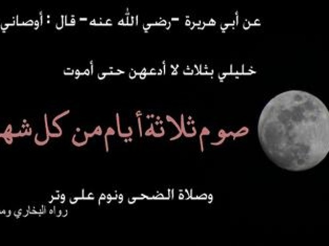 أَوْصَانِي خَلِيلِي بِثَلَاثٍ لَا أَدَعُهُنَّ حَتَّى أَمُوتَ صَوْمِ ثَلَاثَةِ أَيَّامٍ مِنْ كُلِّ شَهْرٍ وَصَلَاةِ الضُّحَى وَنَوْمٍ عَلَى وِتْرٍ