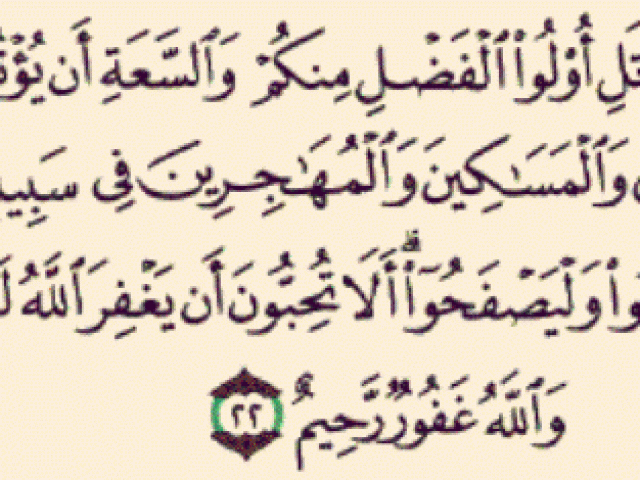 وَلَا يَأْتَلِ أُولُو الْفَضْلِ مِنْكُمْ وَالسَّعَةِ أَنْ يُؤْتُوا أُولِي الْقُرْبَى وَالْمَسَاكِينَ وَالْمُهَاجِرِينَ فِي سَبِيلِ اللَّهِ وَلْيَعْفُوا وَلْيَصْفَحُوا أَلَا تُحِبُّونَ أَنْ يَغْفِرَ اللَّهُ لَكُمْ وَاللَّهُ غَفُورٌ رَحِيمٌ