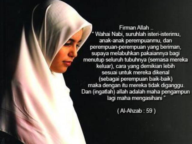 “Hai Nabi, katakanlah kepada isteri-isterimu, anak-anak perempuanmu dan isteri-isteri orang mukmin: Hendaklah mereka mengulurkan jilbabnya ke seluruh tubuh mereka. Yang demikian itu supaya mereka lebih mudah untuk dikenal, karena itu mereka tidak diganggu dan Allah adalah Maha Pengampun lagi Maha Penyayang.” (QS. Al Ahzab: 59)