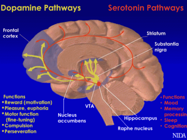 Trus hubungannya ama Direktur yang mati pelan-pelan? Coba liat gambar pathway dopamin yang saya upload di atas. Arah aliran dopamin kan ke bagian PFC, ke rumah direktur. Kalo dopamin banjir, ya loe bayangin ajalah rumah loe kebanjiran. Aktifitas harian loe keganggu kan? Fungsi ‘kemanusiaan’ sang direktur terganggu. Akhirnya jadi disfungsi. Kalo keseringan disfungsi? Lumpuh.. Mati.