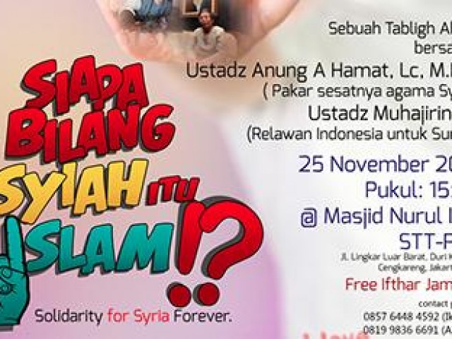 LDK AL-Futuwah dan Himpunan Mahasiswa Mesin STT PLN Bekerjasama dengan Syam Organizer mempersembahkan TABLIGH AKBAR dan AKSI SOLIDARITAS UNTUK MUSLIM SURIAH dengan Tema “SIAPA BILANG SYIAH ITU ISLAM.!?” Sebagai Jawaban Lugas dan Tegas atas kebimbangan sebagian kaum muslimin yang masih menganggap Agama Syiah sebagai bagian dari Agama Islam yang Suci.