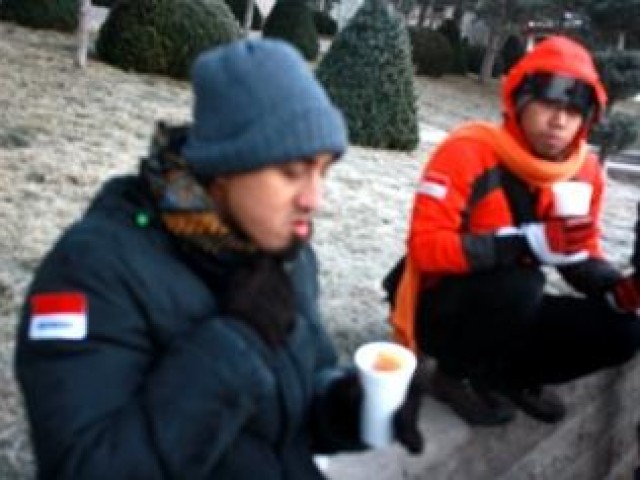 “Ya...ya..” katanya sambil menyodorkan segelas minuman hangat dan roti. Masih dalam suasanan sangat dingin, asap itu mengepul dari dalam gelas, menambah kehangatan kerongkongan dan juga perut. Sambil duduk, kami semua menikmati kehangatan secangkir hidangan penghangat tubuh.