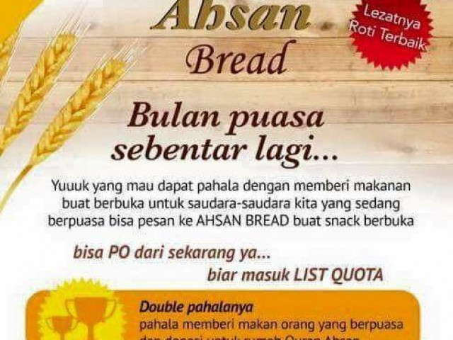 “Al-Hamdulilah pesanan untuk di bagikan ke muslim yang berpuasa sudah mencapai 6000 pcs per hari ini ...” tutur Iwan Kurniadi, pemilik Ahsan Bread di akun Facebooknya.